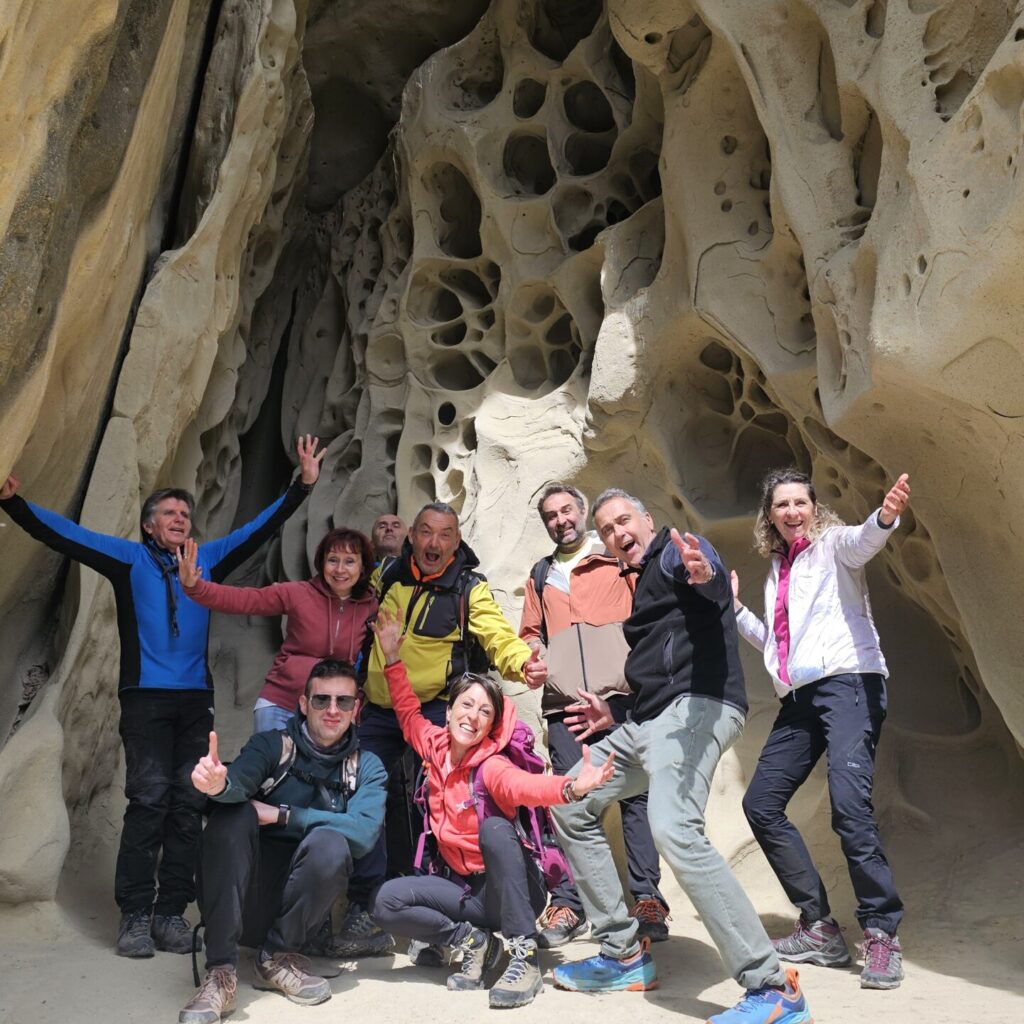 Un’escursione ad anello durante la quale scopriremo alcuni affascinanti borghi medievali, come lo splendido Palazzo D’Affrico, incontreremo enormi monoliti di arenaria che donano al panorama un’atmosfera magica e, infine, raggiungeremo il sito geologico Grotte di Soprasasso. Geometrie dall’aspetto organico intagliate nella roccia, grotte e cavità dalla marcata erosione alveolare dall’aspetto fiabesco e lunare, in un contesto spettacolare dove la natura geologica si fonde col nostro concetto di arte in un’esplosione astratta di forme e “disegni pietrificati” capaci di competere con la migliore installazione d’arte moderna.